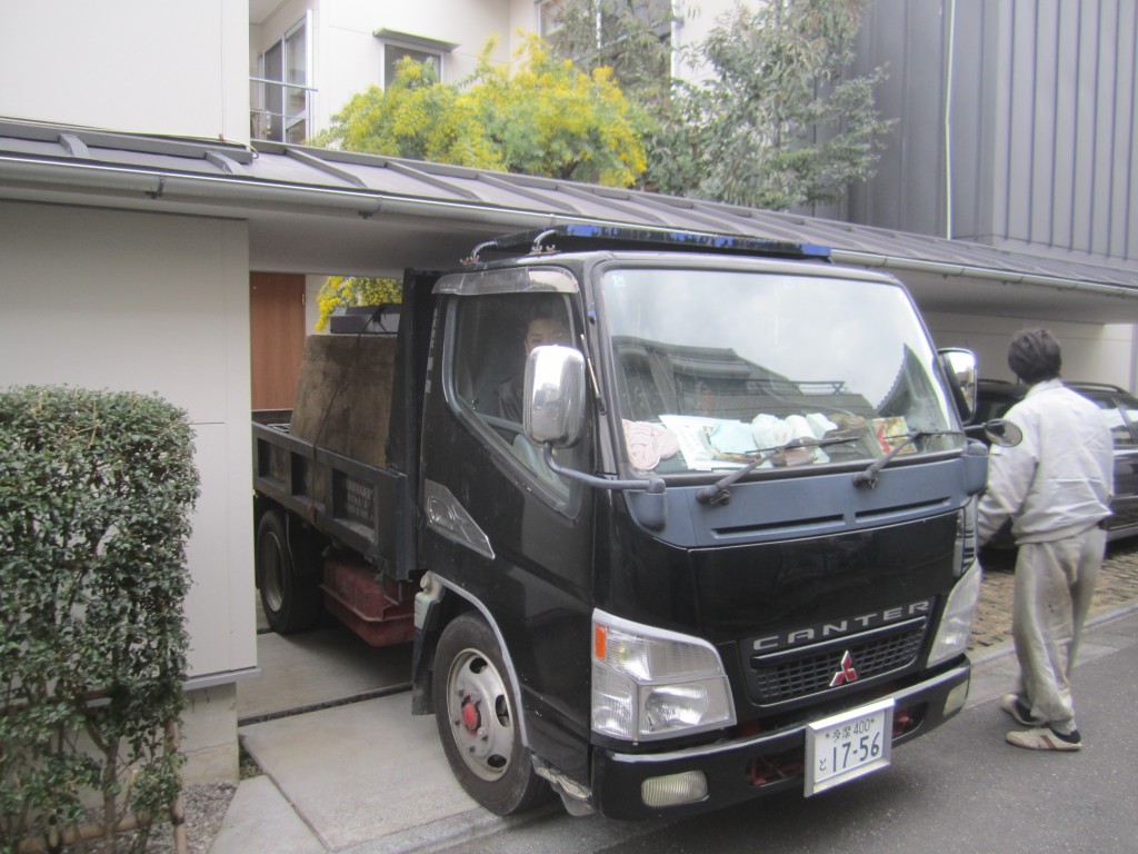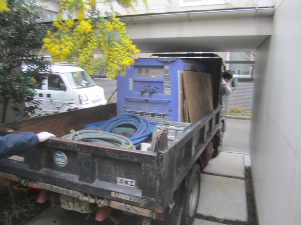 先ず、コンプレッサーを積んだダンプを敷地内に入れるのもギリギリの高さでした。