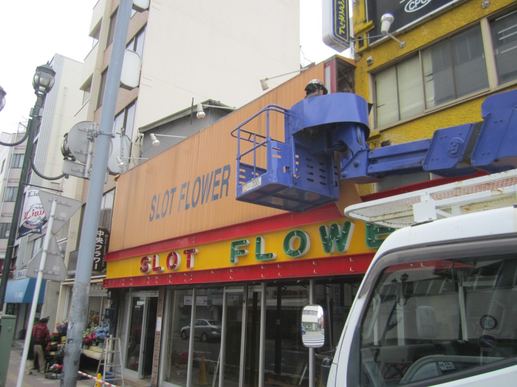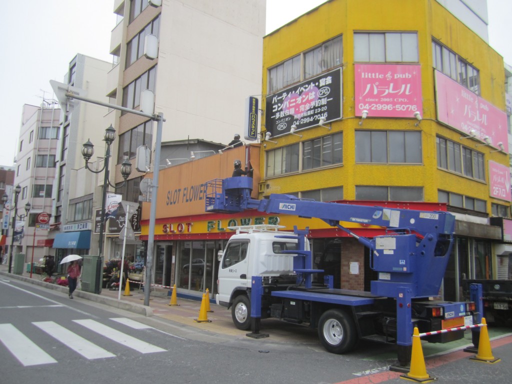 最後に看板の撤去です。 高所作業車を使用しての作業。