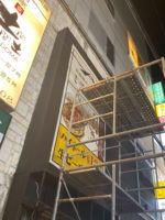 埼玉の草加駅前での看板撤去工事になります。 道路が狭く駅前で交通量が多いので 夜間に足場をかけての作業でした。 電線等がギリギリでもの凄く気をつけながらの作業になりました。 無事に事故やトラブルもなく朝の通勤時間前に作業を終える事ができました。 弊社では駅前や高所の看板等の撤去も得意としております。