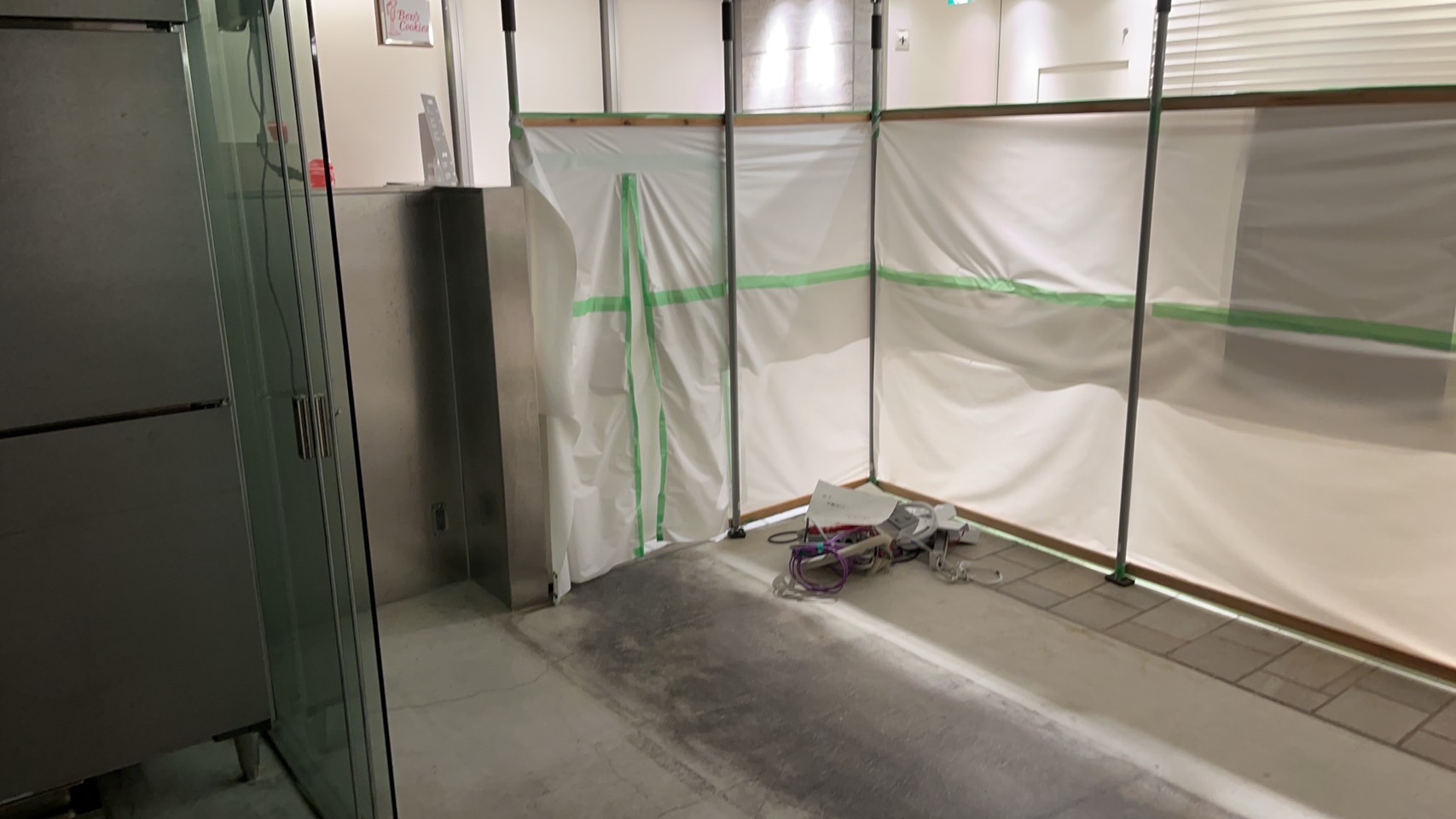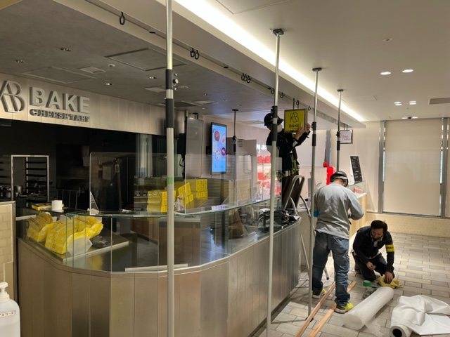 営業前の数時間と営業後の数時間の限られた作業可能時間の中 誇りや飛来物対策の仮囲い等も終わらせないといけない、現場でした。